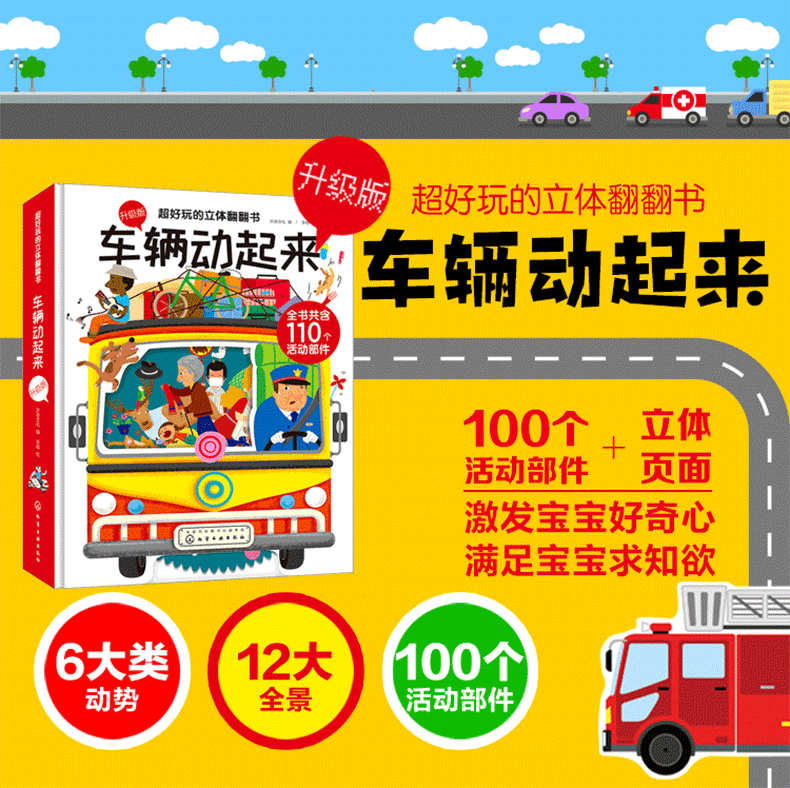 1.书中包含100个活动部件,翻页、滑道、抽拉、铆钉、转盘、立体结构等6大类动势,全面揭秘车辆运转的秘密;