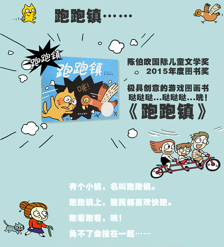 《 信谊图画书奖·跑跑镇》是一本创意游戏书,但是创意并不是天马行空的想象,而是通过两个不相关的东西快跑、碰撞在一起后,变成“新”事物;孩子可以从两个不同的对象上观察趣味的元素,进而联想出两个角色碰撞后可能产生的新变化。整本书充满了创意和趣味,跟着哒哒哒的脚步声,一起享受猜测的游戏乐趣吧!