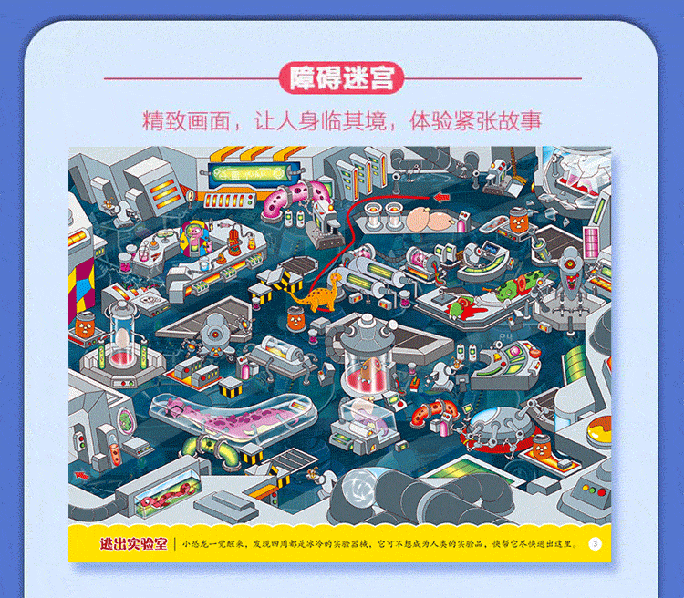 整本多达300个趣味迷宫,每一幅迷宫,都以儿童喜爱的造型为主角,依据故事情节设计玩法多变的迷宫路线;每一个迷宫都是一段新奇多变的冒险故事,足以让喜欢迷宫的小朋友过足游戏瘾,通过迷宫通关获得专注力、分析力、思维力、语言表达能力、自信心的大提升!