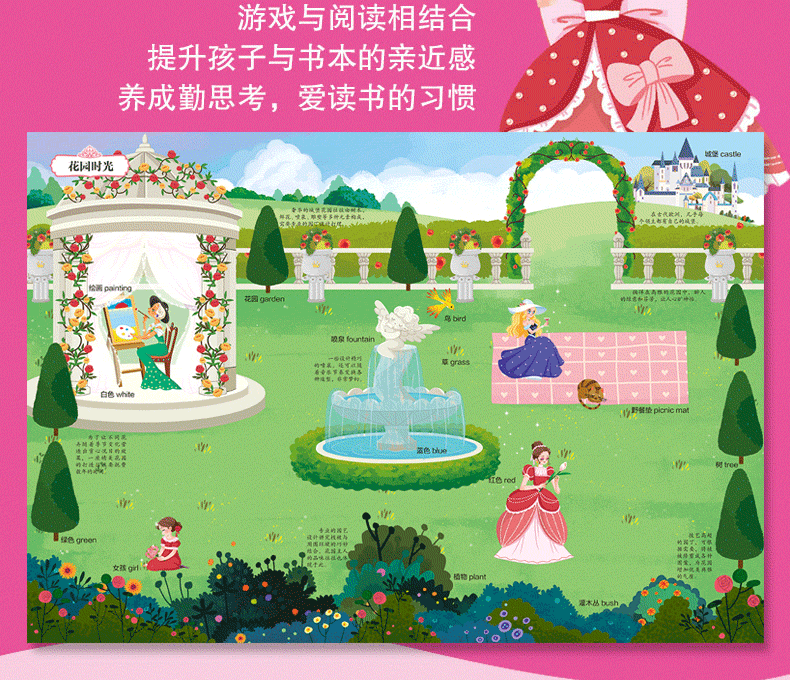 孩子可在欢乐宴会上了解餐饮、社交礼仪;在优雅下午茶的画面中,熟悉贵族的休闲日常;在浪漫舞会中掌握宫廷音乐流行知识;在花园时光中欣赏宫廷园艺设计;在精致梳妆台前为可爱的小公主梳妆打扮。