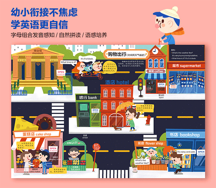 2.题目形式专为培养孩子兴趣而设计。跟随来到地球的外星人一家,在糖糖、熊熊姐弟俩的帮助下,在活力运动场上熟悉各种体育爱好名称、在农场认识各种动物,理解方位描述方法,在欢乐的生日派对上掌握各种食物名称,熟练表达自己对食物的需求等,活泼可爱的生活化场景,增加代入感;